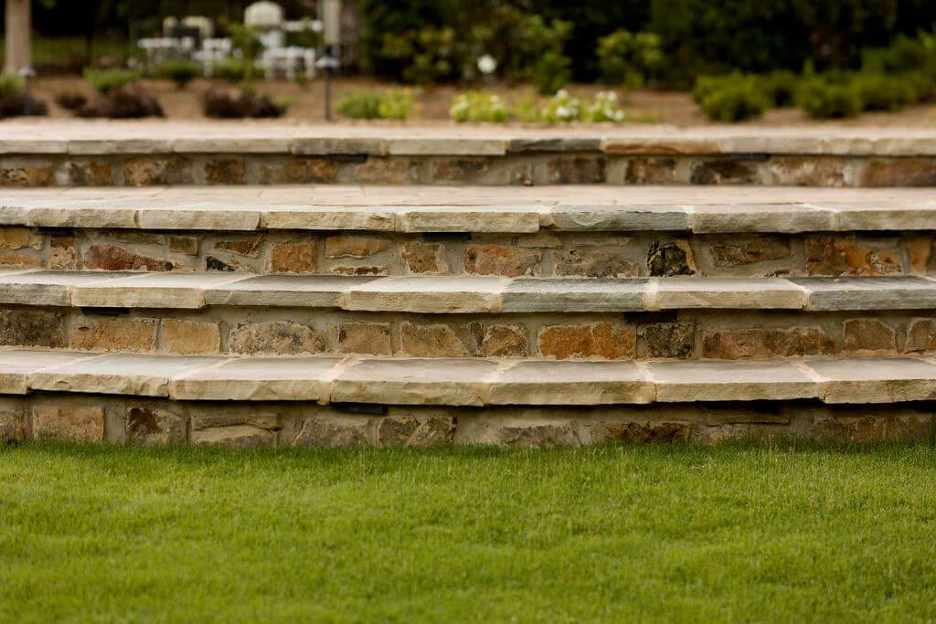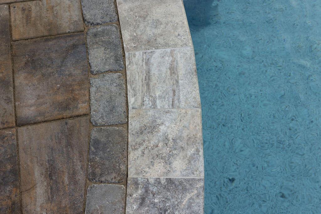 A mix of natural stone and pavers were used for the patios, pool deck, stairs, and other features such as a distinct granite waterfall feature cascading down from the raised spa. Plants were selected to fill in space and provide privacy where needed, while still allowing for plenty of light and an open feel.