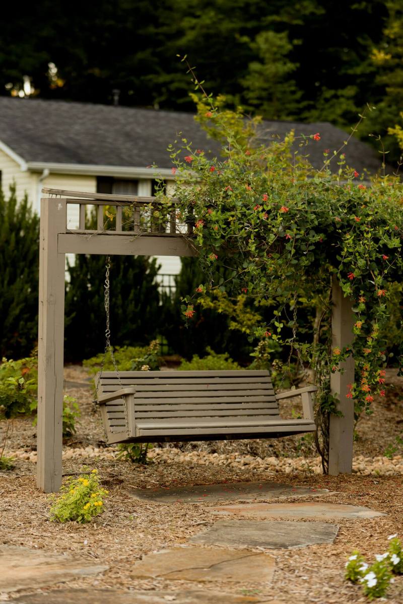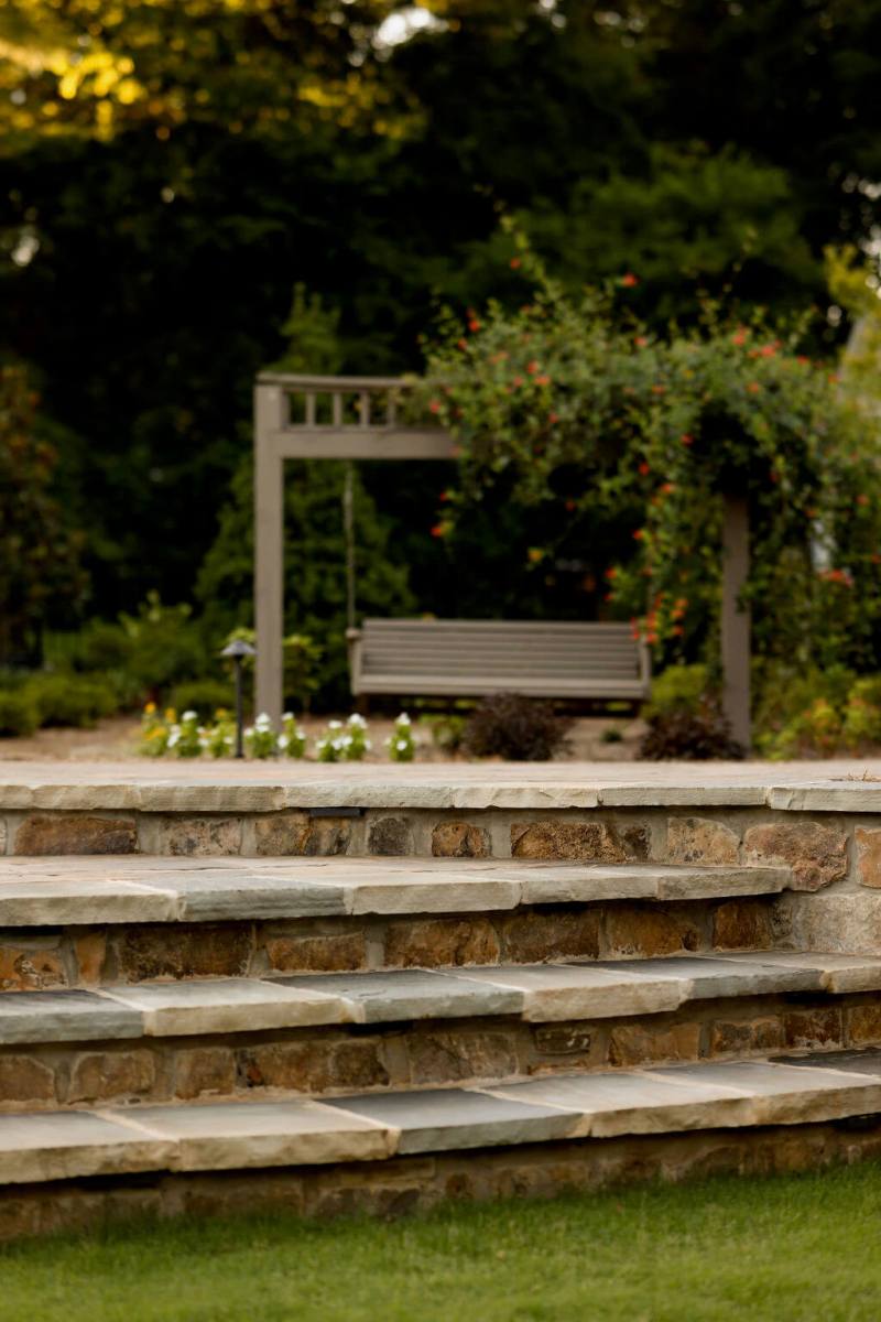 The pool’s DiamondBrite™ plaster surface has a long lifespan, especially in a well-maintained saltwater pool. Wood features like a swing/trellis combo and benches provide comfortable little niches to enjoy, and landscape lighting allows for easy entertainment after dark.